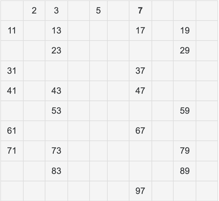 이 방법은 체로 거르듯이 수를 걸러낸다고 해서 어레토스네스의 체라고 불린다. 1 ~ 100 중에 소수를 찾아보자. 1은 예외 이므로 항상 지워둔다. 기본적인 개념은 남아있는 수는 소수라고 판별한다. 2부터 시작한다. 남아있으므로 소수로 판별한 후 2의 배수 4, 6, 8, 10, 12,, 100를 다 지운다. 2의 배수니까 당연히 2로 나누어지고 1과 본인이 아닌 수로 나누어지기에 소수가 아니다. 그다음 남아있는 수를 찾는다. 3이다. 남아있으니까 소수로 저장하고 3의 배수 6, 9, 12,,, 99를 다 지운다. 그다음 4는 2를 저장할 때 지웠고 5가 남아있다. 역시 5를 저장하고 5의 배수들을 다 지운다. 이것을 언제까지 진행해야 할까? 100의 제곱 근을 내림한 수 => 10까지만 하면 된다. 가장 큰 수가 100이니 100의 제곱 근의 배수들까지 처리하면 1 ~ 100 중 소수만 남게 된다. (지우는 것을 배열에 False로 작성하든 방법은 본인의 자유)