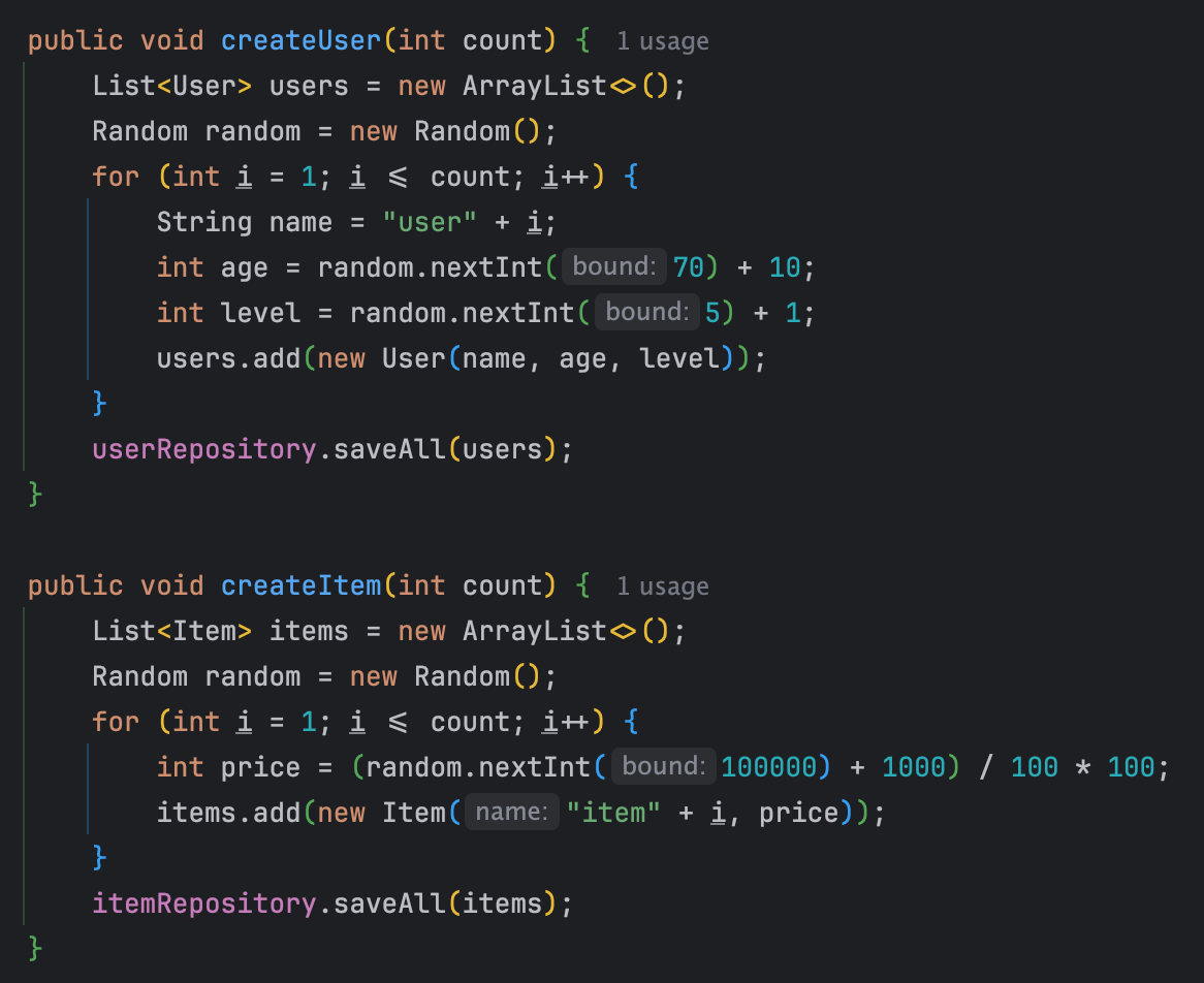 하지만 이 방법을 사용하면 INSERT 쿼리가 userCount만큼 발생하게 된다. 내 상황에서는 쿼리가 1000만 개 발생하는 것이다. saveAll()을 사용해서 하나의 트랜잭션 안에 넣었지만 쿼리의 양이 너무 많아진다. 실제로 해당 코드의 동작과 동일하게 우선 Item, User의 데이터를 각각 100만 개를 INSERT 했을 때 아래와 같은 결과가 나타났다.
