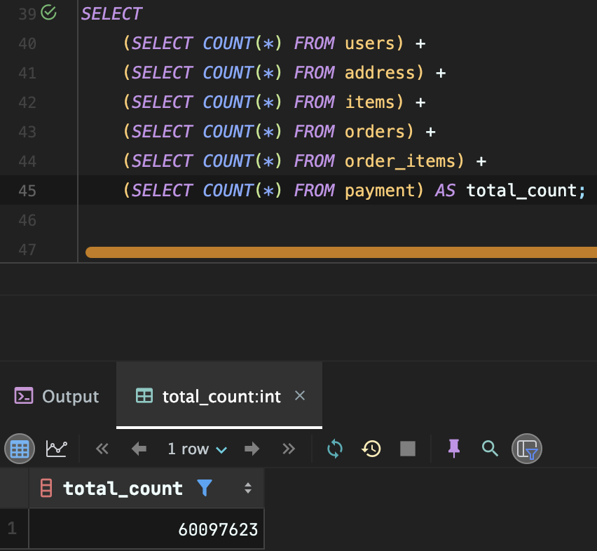 이를 토대로 6개의 테이블을 만들고 하나의 테이블 당 1000개부터 시작해서 1000만 개로 크기를 늘려가며 데이터를 INSERT 해보았다. 결과적으로 전체 약 6000만 개의 데이터를 갖고 프로젝트를 시작했다. 이 과정에서 있었던 일을 순차적으로 서술해보려 한다.