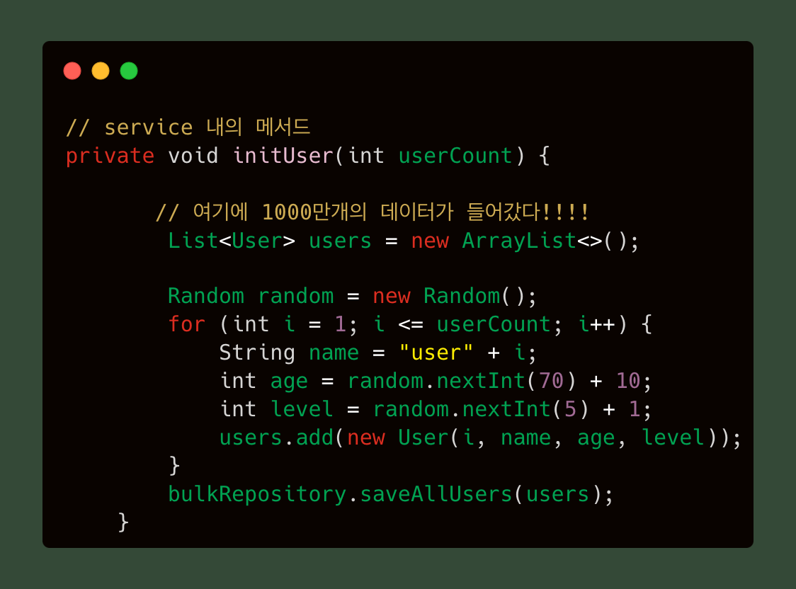 지금까지의 테스트 과정을 거치고 데이터를 테이블 당 1000만개로 증가시켰다. 이때 전설의 Out Of Memory 문제를 마주하게 되었다. 원인은 Bulk Insert 시 1000만 개의 데이터를 하나의 컬렉션에 한번에 집어넣었고, jdbcTemplate.batchUpdate()에서도 1000만개의 데이터를 저장한다.