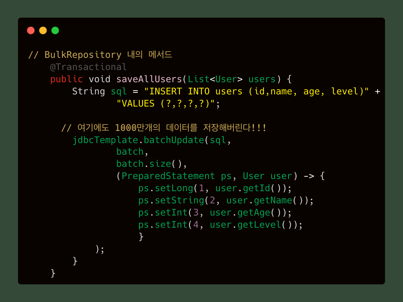 그래서 내가 선택한 방법은 JDBC 레벨에서 Multi-Value Insert를 구현하는 것이다.